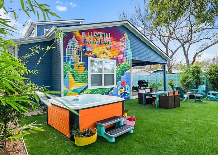 Set in the vibrant heart of Austin, the Stylish 4Br With Infrared Sauna, Hot Tub, Cornhole and Cowboy Pool offers an exquisite retreat that flawlessly combines luxury, comfort, and modern amenities. Just 10 kilometers from both the enchanting Zilker Zephyr Miniature train and the busy Austin-Bergstrom International Airport, this residence provides easy access to the city's bustling attractions while ensuring a tranquil escape.